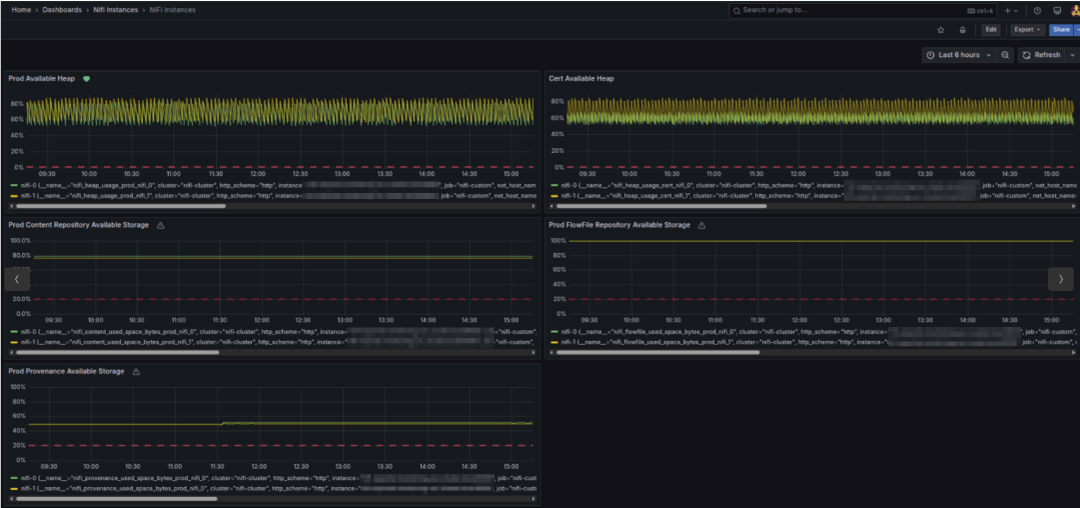 • Recursos adicionales: además del monitoreo tradicional de servicios contenerizados, se incorporó visibilidad sobre componentes críticos del ecosistema de datos como Apache NiFi, Kafka y AWS Glue. Esta integración permitió trazabilidad y alertamiento sobre flujos de datos complejos, procesamiento de eventos y orquestación de cargas, aspectos clave para mantener la operación de Flypass bajo control.